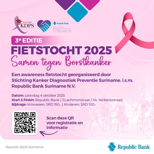 Maatschappelijke betrokkenheid staat bij Republic Bank centraal en gaat verder dan financiële dienstverlening. Door actief aanwezig te zijn en de handen uit de mouwen te steken, laat de bank zien dat betekenisvolle daden van zorg een groot verschil kunnen maken. Stap voor stap wordt bijgedragen aan een betere toekomst, met binnenkort onder meer een awareness-fietstocht tegen borstkanker op 4 oktober, georganiseerd door Stichting Kanker Diagnostiek Preventie Suriname in samenwerking met Republic Bank.