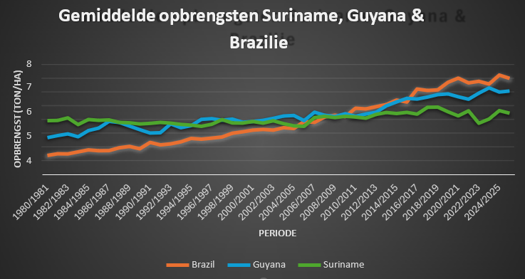 Data van de USDA laat zien dat Suriname rond 2007 de aansluiting met buurland Guyana definitief is verloren. Terwijl zij kozen voor groei via internationale kennispartnerschappen, bleven wij steken in verouderde patronen. Het resultaat is pijnlijk: een Braziliaanse boer oogst gemiddeld ruim het dubbele van zijn Surinaamse collega. Waar onze opbrengsten stagneren rond de 4 ton per hectare, behalen moderne systemen in Brazilië en Uruguay al 8 tot 9 ton. Hoewel de technologie om dit gat te dichten bestaat, maken wij er onvoldoende gebruik van.
