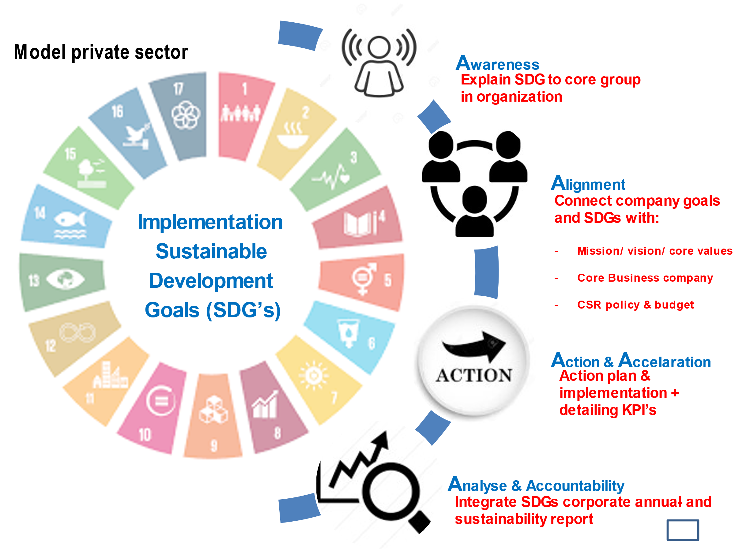 - Werken aan de ontwikkeling van concrete KPI’s per SDG teneinde de bijdrage van de private sector te concretiseren